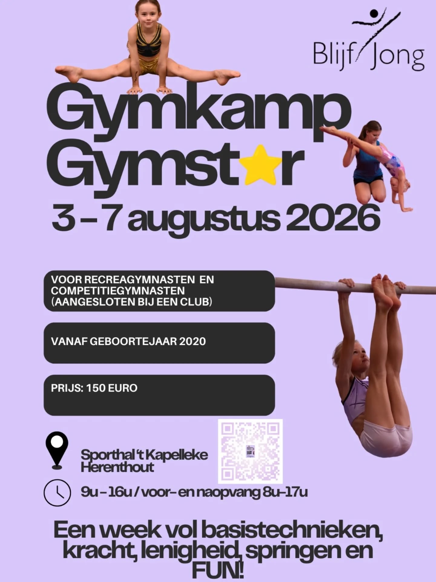 - Doelgroep: recreanten en competitiegymnasten vanaf geboortejaar 2020, aangesloten bij een club